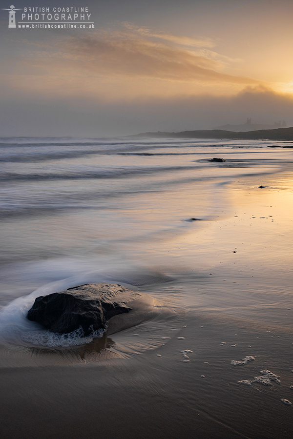 This is Embleton Bay in Northumberland at sunrise. The mist was clinging to the sea cliffs where Dunstanburgh Castle is on this particular morning as can be seen. You can just about see the castle through the mist on the horizon. |